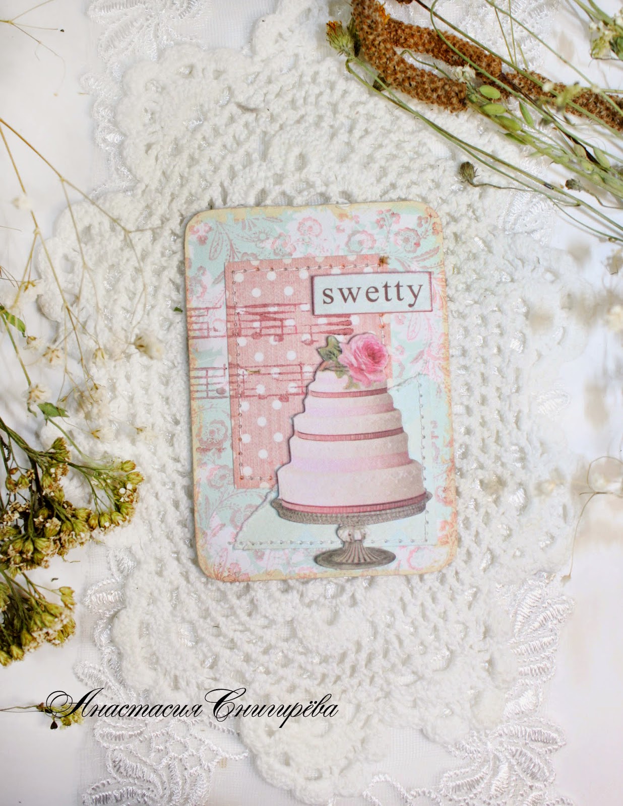 Материалы: бумага Тильда и Скрапберрис (обрезки), штампинг фоновый цветы и ноты, вырубки Тильды (тортики), акрил